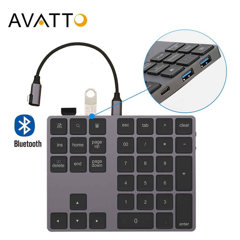 AVATTO Aluminum Alloy Bluetooth Wireless Numeric Keypad with USB HUB Digital Input Function for Windows,Mac OS,Android laptop PC