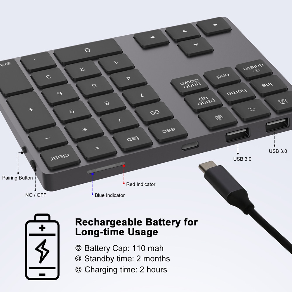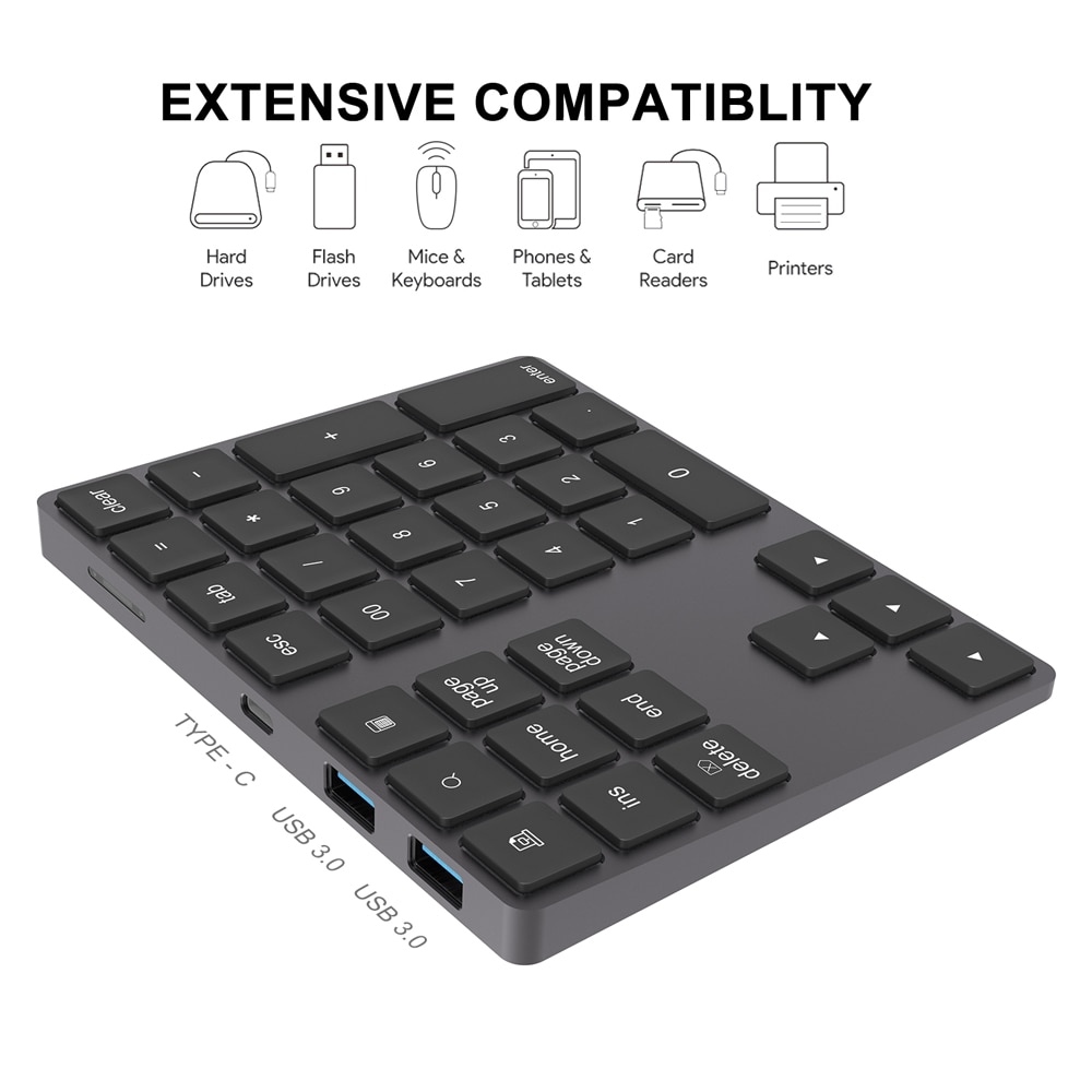 AVATTO Aluminum Alloy Bluetooth Wireless Numeric Keypad with USB HUB Digital Input Function for Windows,Mac OS,Android laptop PC